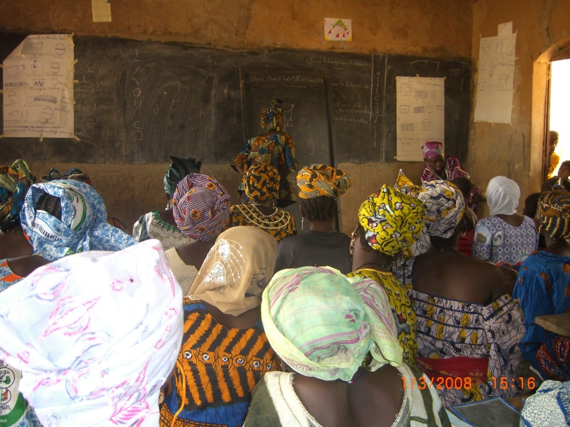 Sur deux ans, des femmes volontaires ont suivi une formation d’alphabétisation selon la méthode REFLECT, intégrant l’apprentissage de la lecture en bambara , du calcul et des fondamentaux (poids et mesures, mesure du temps, notions d’hygiène, de nutrition, sevrage des enfants, vote, etc…