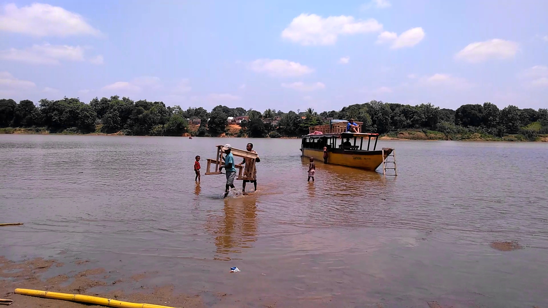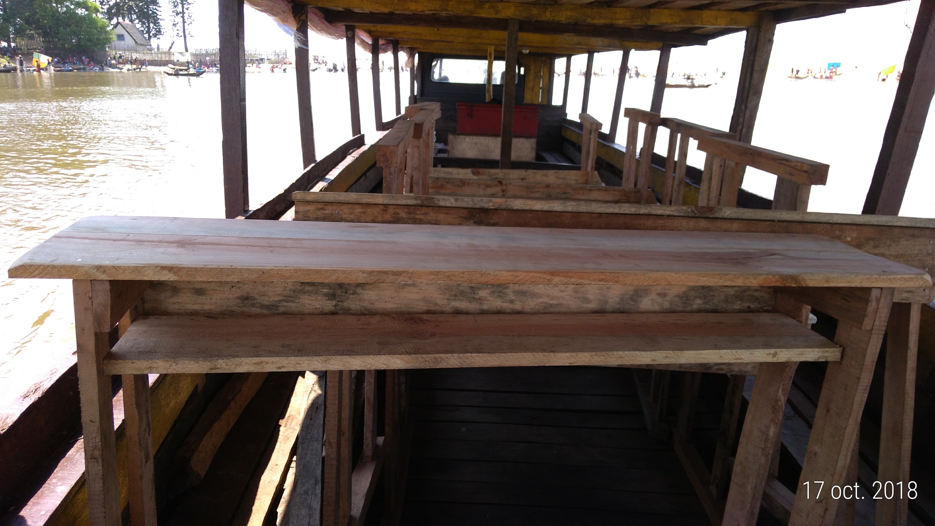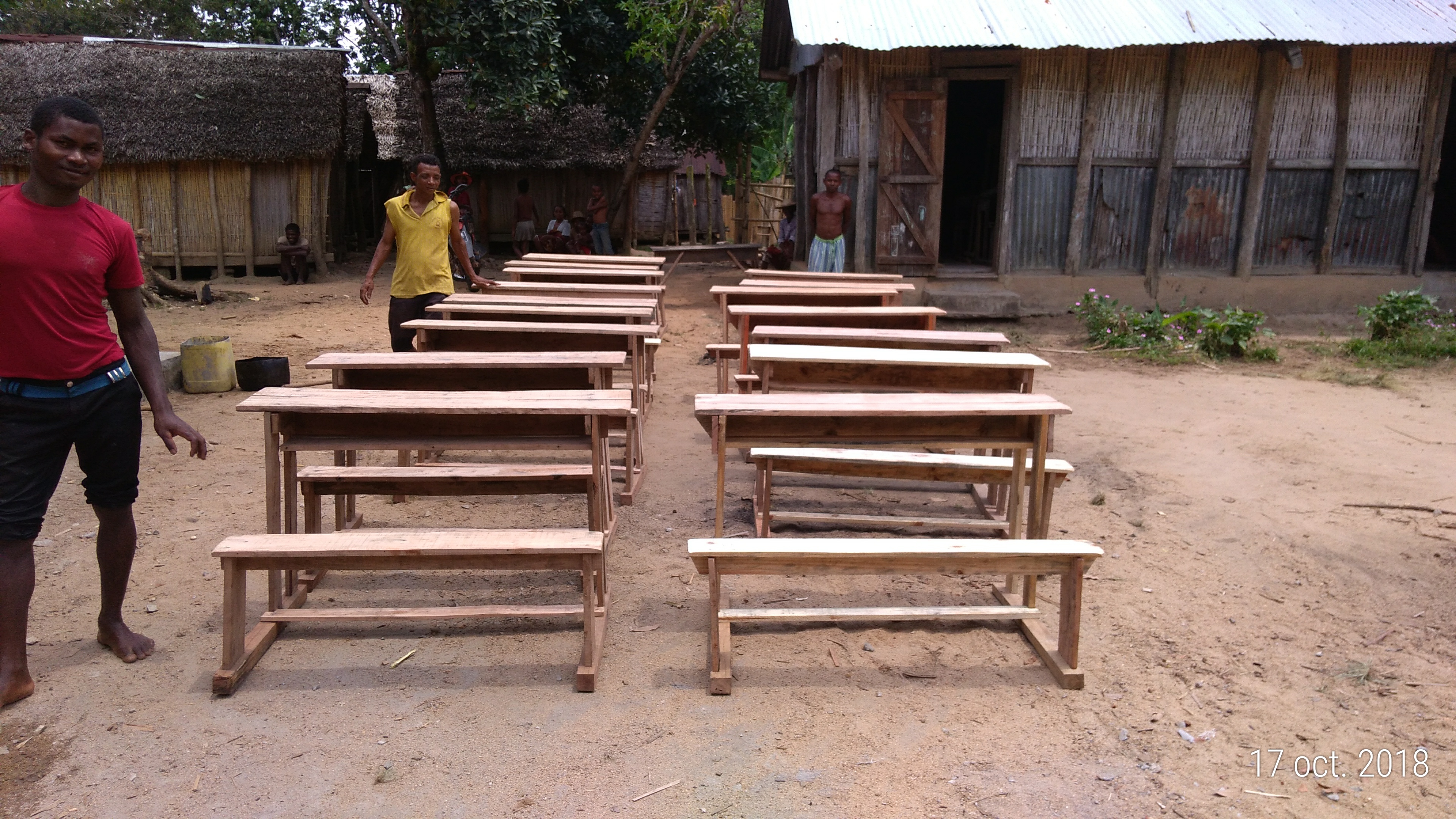 La première priorité est la rénovation de l’école. Malheureusement, le cyclone AWA a pratiquement rasé celle-ci en janvier 2018 avant le commencement des travaux. Il faut donc reconstruire. Avant d’avoir les fonds nécessaires nous avons fait fabriqué 50 tables et bancs. Les voilà embarqués sur la pirogue pour être acheminés au village.